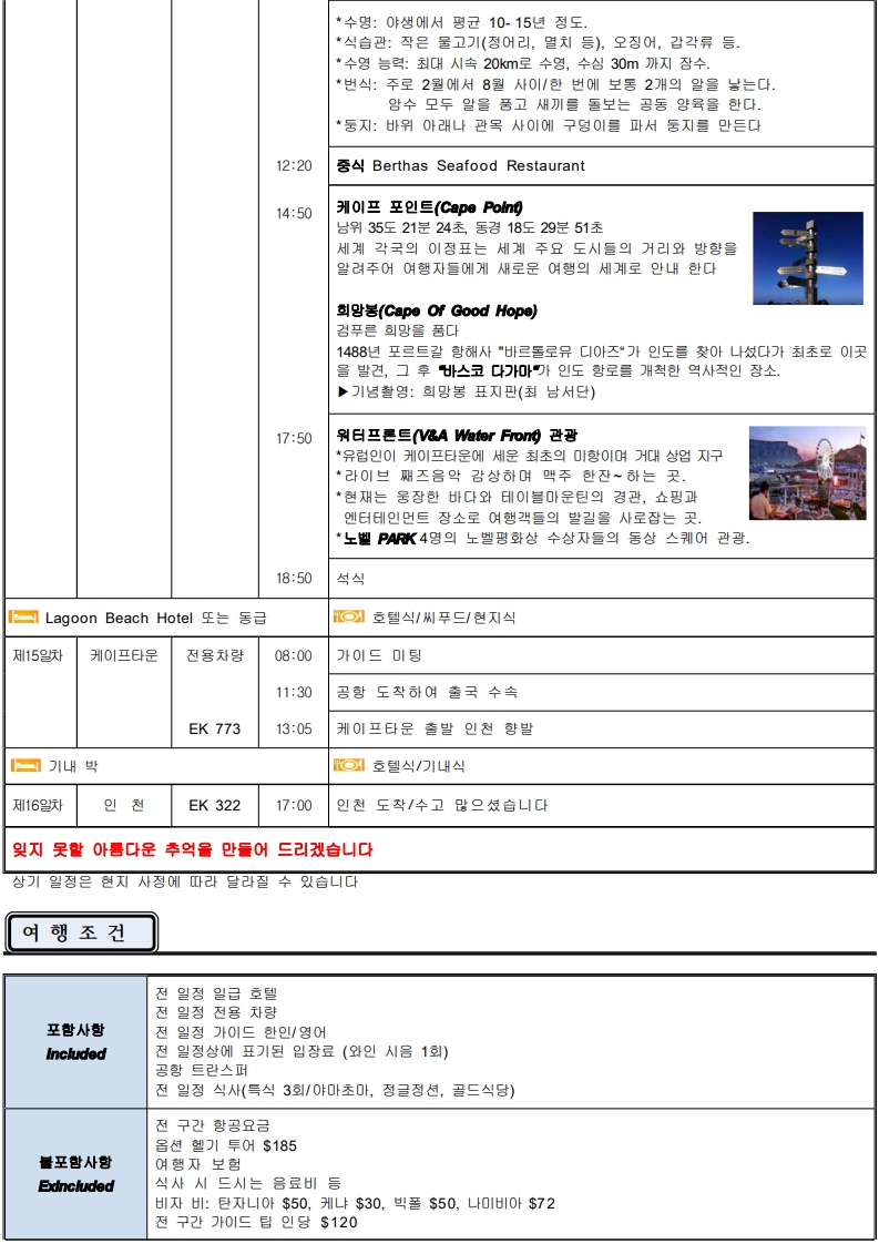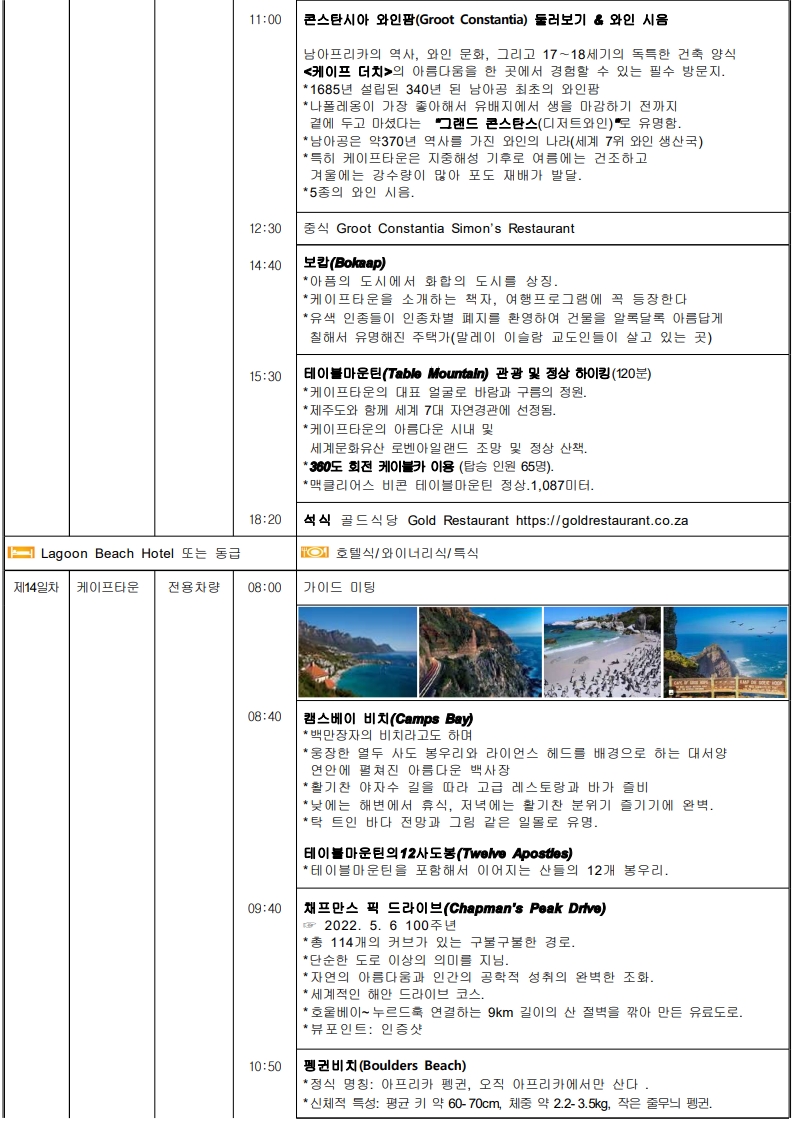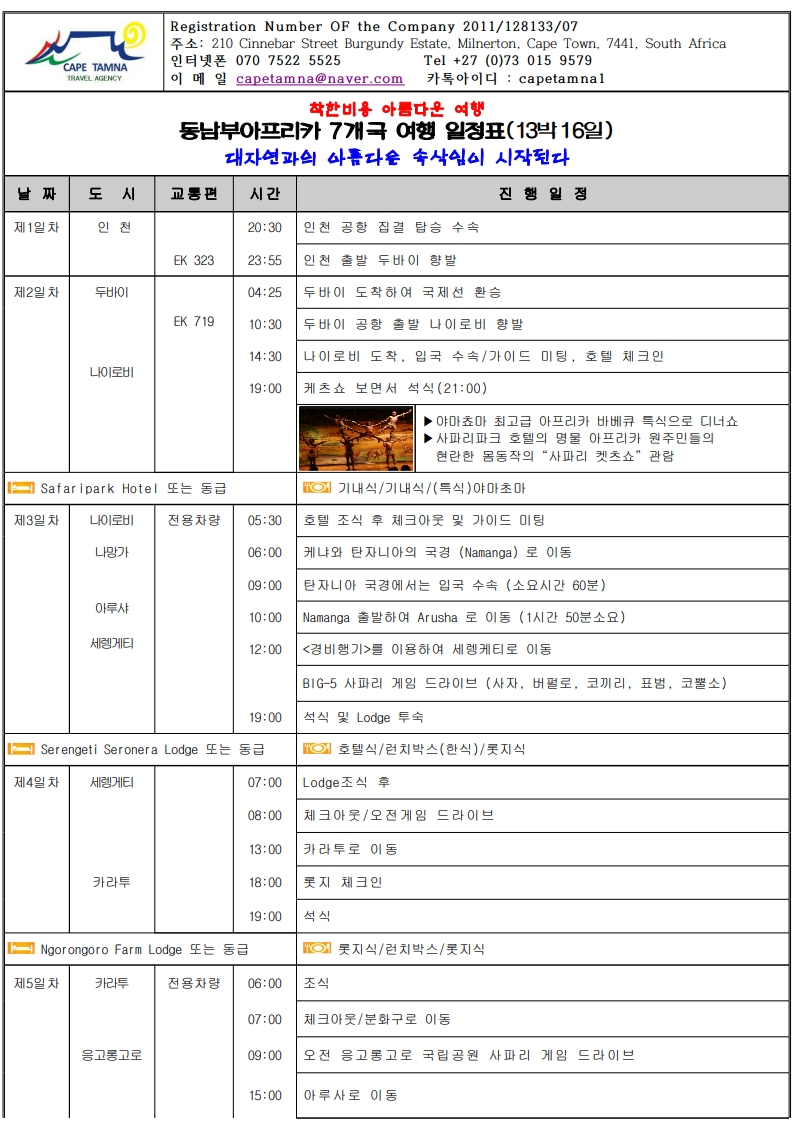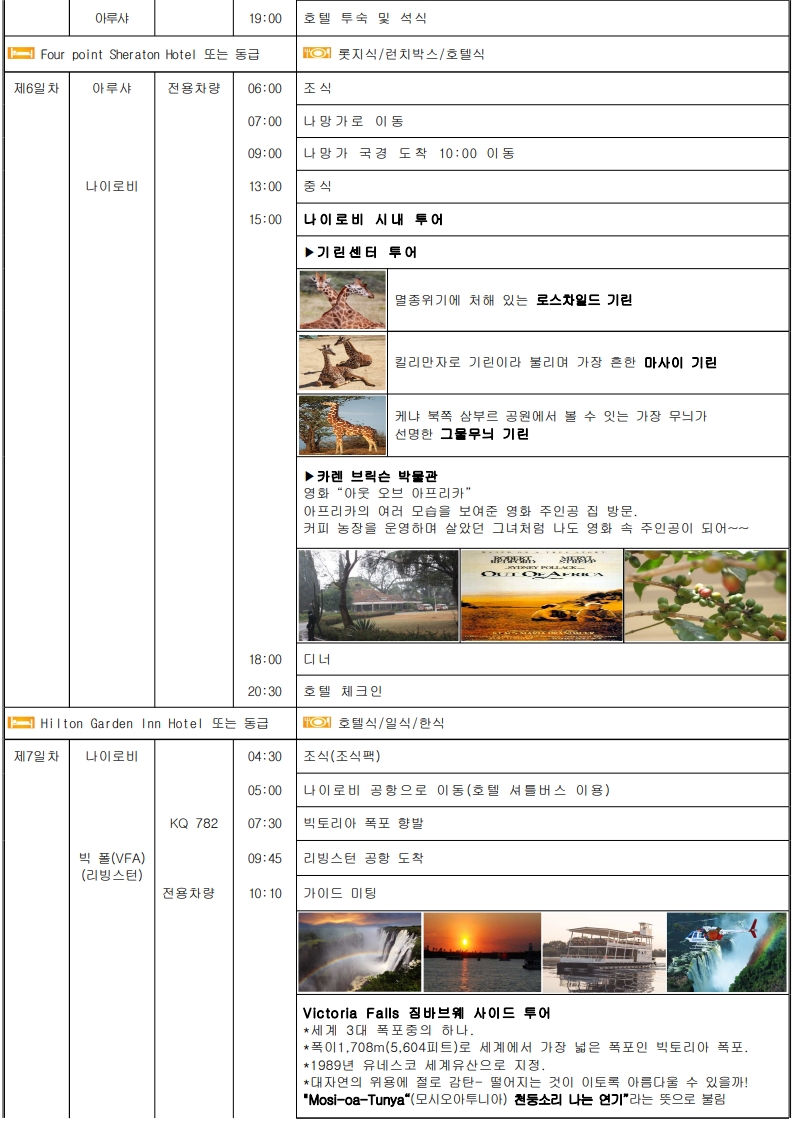 ★대자연의 경이로움★ ● 세렝게티 -풍부한 야생 동물의 의 '대이동(Great Migration)'~으로 숨 막힐 듯 아름다운 풍경. -끝없는 평원의 환상적인 여행 !! -단순한 여행이 아닌 자연의 위대함과 생명의 순환을 직접 목격. -아프리카의 원시적인 자연과 다양한 야생동물들의 삶을 -가까이에서 관찰할 수 있는 평생 잊지 못할 추억을 선사. ●케냐 - CAT’S SHOW - 아웃 오브 아프리카 --영화 속 주인공 <카렌>이 되어... - 하룻밤 소원"은 지라프매너(기린)호텔"에서 ~ ● 나미브사막의 매력에 취해 보세요 "낮에는 모래언덕, 밤에는 별빛 - 사막의 감동" -자연이 빚어낸 극적인 순간 -108m 세상에서 가장 긴 빅토리아 폭포의 선물과 쵸베 사파리 ● 아프리카 속의 유럽 케이프타운 ▶ 특식 3회 => 야마초마, 랍스터, 골드 레스토랑
