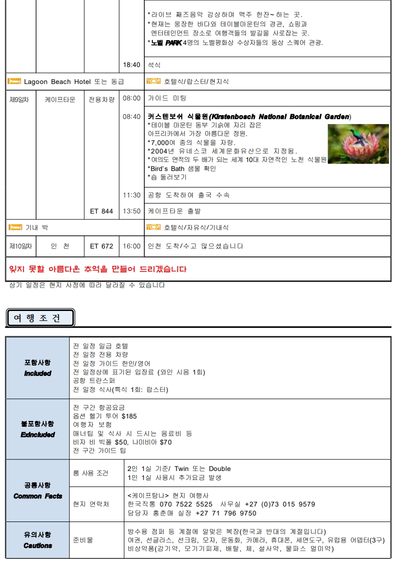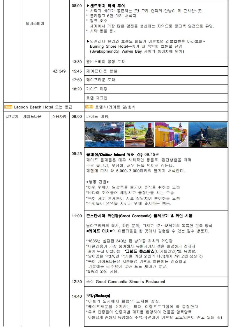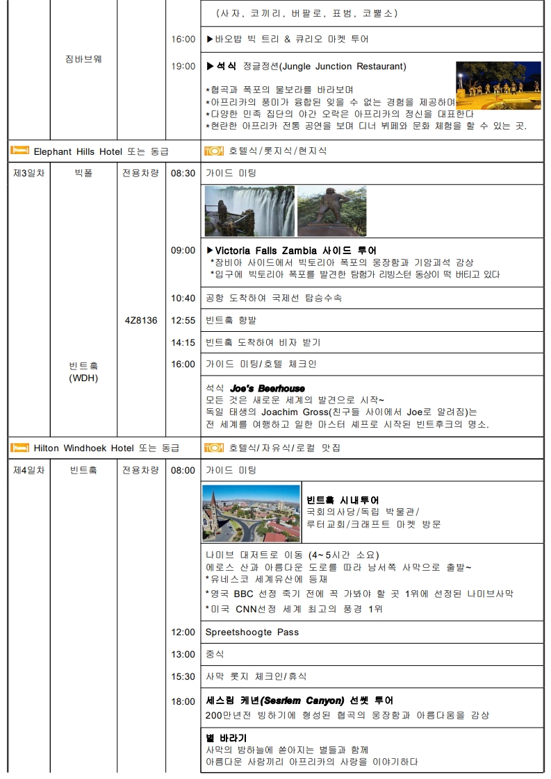 ★아프리카의 심장★ "낮에는 모래언덕, 밤에는 별빛, 사막의 감동" ●나미브사막의 매력에 취해 보세요 ●자연이 빚어낸 극적인 순간 =>108m 세상에서 가장 긴 빅토리아 폭포의 선물과 쵸베 국립공원 사파리 ●아프리카 속의 유럽 케이프타운 ●2회 => 랍스터, 골드 레스토랑