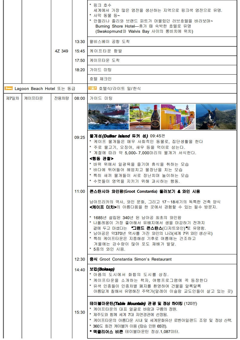 ★아프리카의 심장★ "낮에는 모래언덕, 밤에는 별빛, 사막의 감동" ●나미브사막의 매력에 취해 보세요 ●자연이 빚어낸 극적인 순간 =>108m 세상에서 가장 긴 빅토리아 폭포의 선물과 쵸베 국립공원 사파리 ●아프리카 속의 유럽 케이프타운 ●2회 => 보마식당, 골드 레스토랑