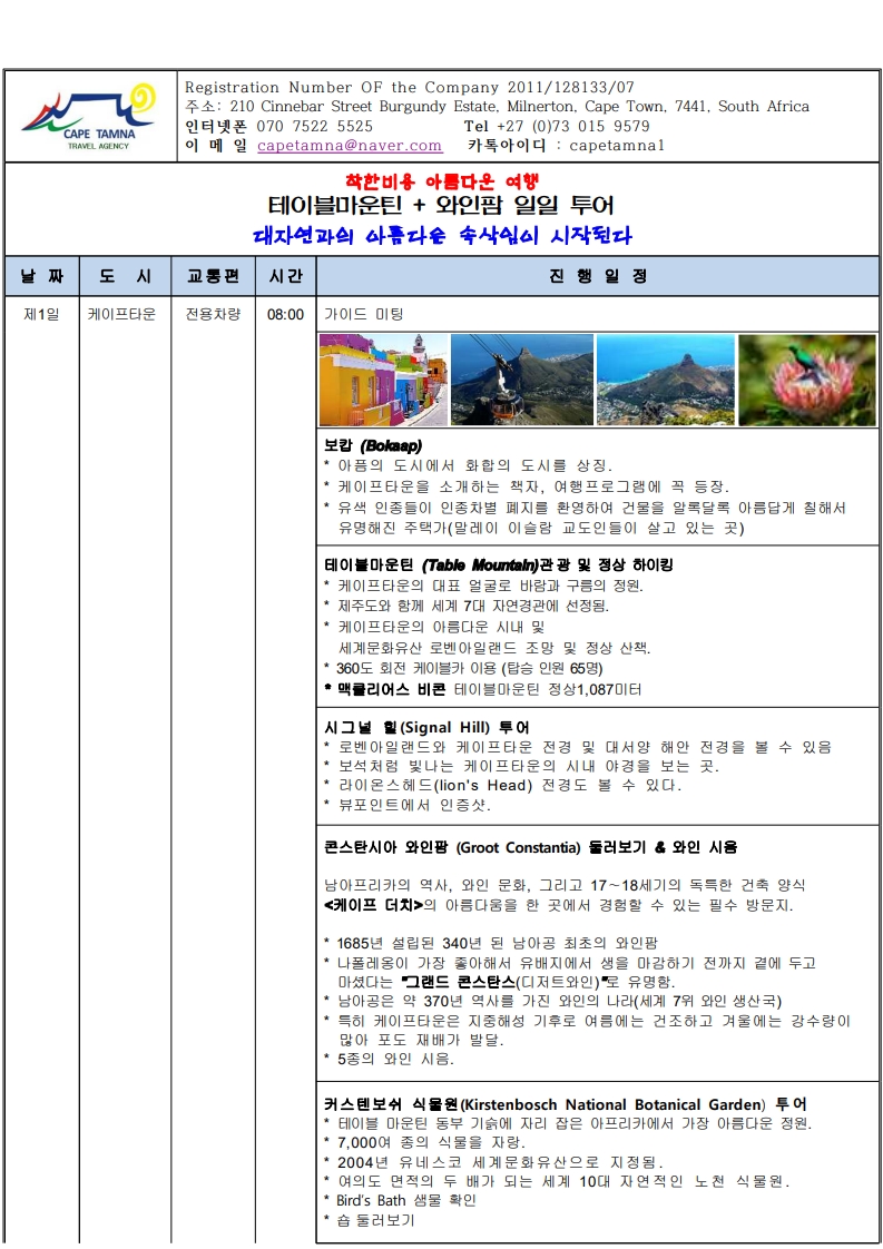 ★케이프타운의 대표 얼굴★ ●360도 회전 케이블카 탑승, 제주도와 함께 세계 7대 자연경관으로 선정. ●나폴레옹이 좋아해서 늘 곁에 두고 마셨다는 "그랜드 콘스탄시아(디저트)와인" 유명. ●워터프론트=> 케이프타운 최초의 항구,쇼핑센터 즐비 ●라이브 째즈음악 감상하며 생맥주 한잔~