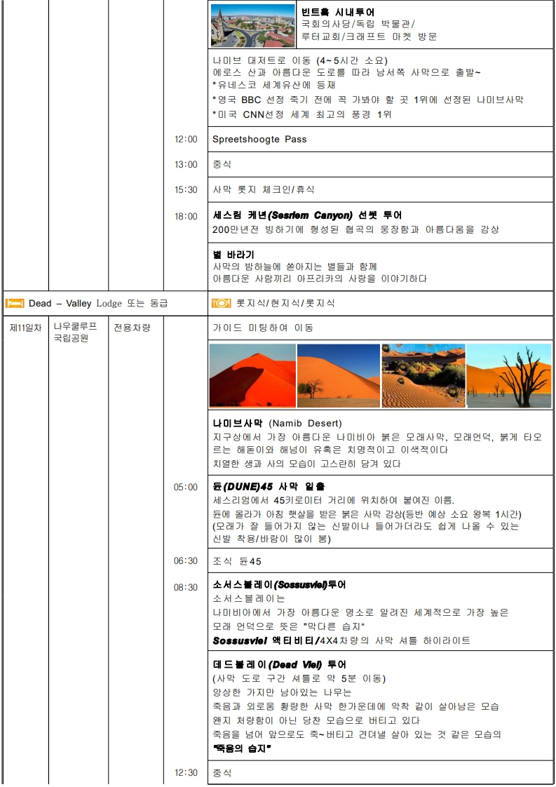 ★대자연의 경이로움★ ● 세렝게티 -풍부한 야생 동물의 의 '대이동(Great Migration)'~으로 숨 막힐 듯 아름다운 풍경. -끝없는 평원의 환상적인 여행 !! -단순한 여행이 아닌 자연의 위대함과 생명의 순환을 직접 목격. -아프리카의 원시적인 자연과 다양한 야생동물들의 삶을 -가까이에서 관찰할 수 있는 평생 잊지 못할 추억을 선사. ●케냐 - CAT’S SHOW - 아웃 오브 아프리카 --영화 속 주인공 <카렌>이 되어... - 하룻밤 소원"은 지라프매너(기린)호텔"에서 ~ ● 나미브사막의 매력에 취해 보세요 "낮에는 모래언덕, 밤에는 별빛 - 사막의 감동" -자연이 빚어낸 극적인 순간 -108m 세상에서 가장 긴 빅토리아 폭포의 선물과 쵸베 사파리 ● 아프리카 속의 유럽 케이프타운 ▶ 특식 3회 => 야마초마, 랍스터, 골드 레스토랑