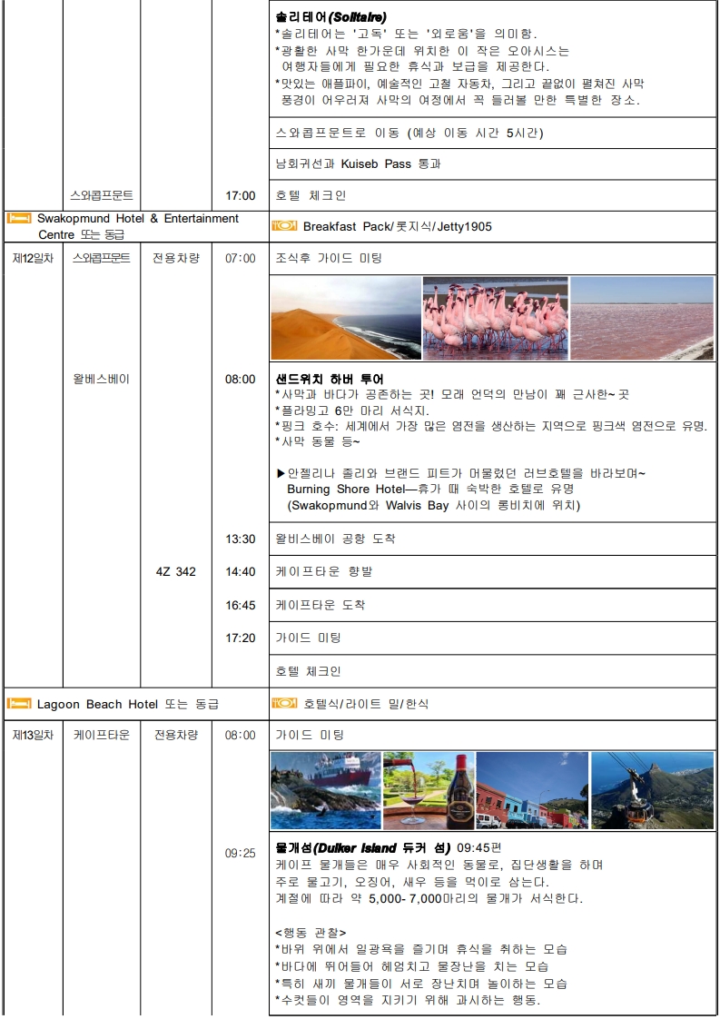 ★대자연의 경이로움★ ● 세렝게티 -풍부한 야생 동물의 의 '대이동(Great Migration)'~으로 숨 막힐 듯 아름다운 풍경. -끝없는 평원의 환상적인 여행 !! -단순한 여행이 아닌 자연의 위대함과 생명의 순환을 직접 목격. -아프리카의 원시적인 자연과 다양한 야생동물들의 삶을 -가까이에서 관찰할 수 있는 평생 잊지 못할 추억을 선사. ●케냐 - CAT’S SHOW - 아웃 오브 아프리카 --영화 속 주인공 <카렌>이 되어... - 하룻밤 소원"은 지라프매너(기린)호텔"에서 ~ ● 나미브사막의 매력에 취해 보세요 "낮에는 모래언덕, 밤에는 별빛 - 사막의 감동" -자연이 빚어낸 극적인 순간 -108m 세상에서 가장 긴 빅토리아 폭포의 선물과 쵸베 사파리 ● 아프리카 속의 유럽 케이프타운 ▶ 특식 3회 => 야마초마, 랍스터, 골드 레스토랑