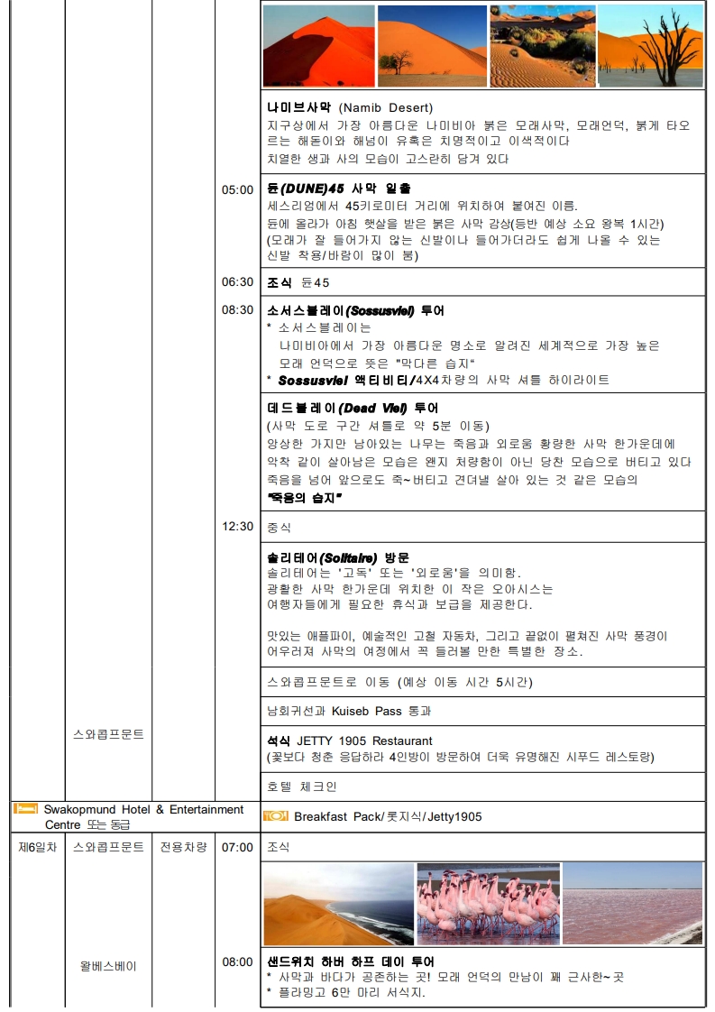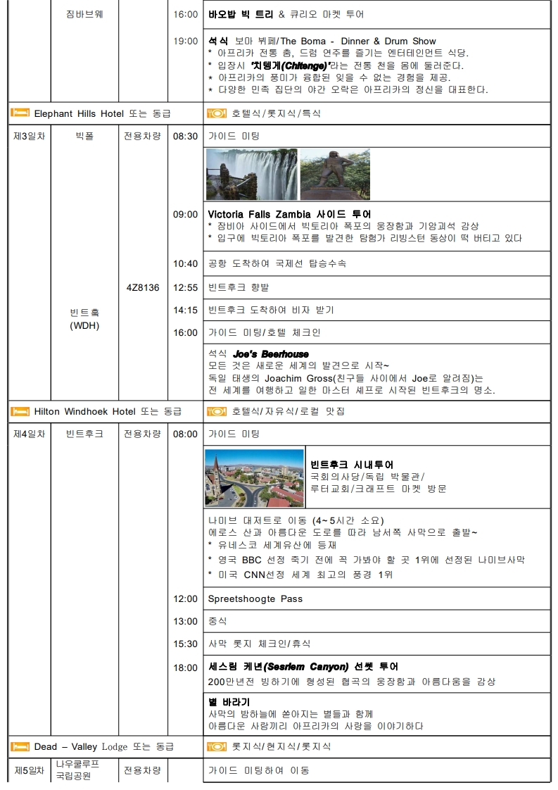 ★아프리카의 심장★ "낮에는 모래언덕, 밤에는 별빛, 사막의 감동" ●나미브사막의 매력에 취해 보세요 ●자연이 빚어낸 극적인 순간 =>108m 세상에서 가장 긴 빅토리아 폭포의 선물과 쵸베 국립공원 사파리 ●아프리카 속의 유럽 케이프타운 ●2회 => 보마식당, 골드 레스토랑