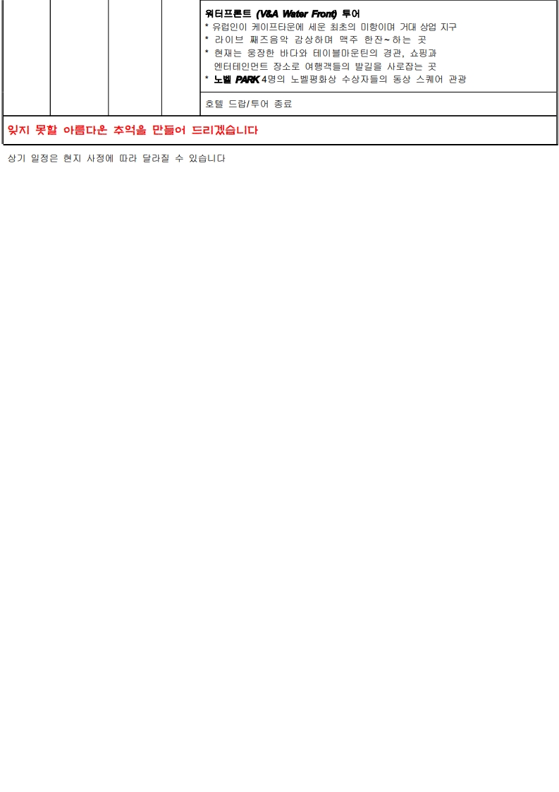 ★케이프타운의 대표 얼굴★ ●360도 회전 케이블카 탑승, 제주도와 함께 세계 7대 자연경관으로 선정. ●나폴레옹이 좋아해서 늘 곁에 두고 마셨다는 "그랜드 콘스탄시아(디저트)와인" 유명. ●워터프론트=> 케이프타운 최초의 항구,쇼핑센터 즐비 ●라이브 째즈음악 감상하며 생맥주 한잔~