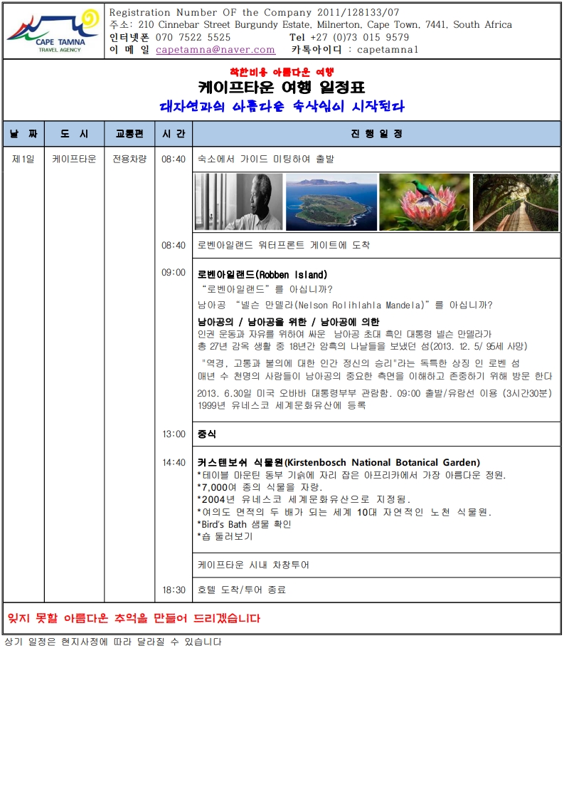 ★로밴섬을 아십니까★ ●섬은 대표하는 아프리카의 역사를 말한다. 500 년 역사의 다층적 역사를 가진 섬! ●“넬슨 만델라(Nelson Rolihlahla Mandela)”가 28년 옥살이 중 18년간 갇혀 생활한 섬!! ●더불어 살고 또 더불어 살으리! ●남아공 의 / 남아공을 위한 / 남아공에 의한 ★커스텐보쉬 식물원 ★ ●7,000여종의 식물을 자랑. ●동부 기슭에 자리 잡은 아프리카에서 가장 아름다운 정원. ●유일하게 세계문화 유산으로 등록/세계 10대(자연적인 노천)식물원.
